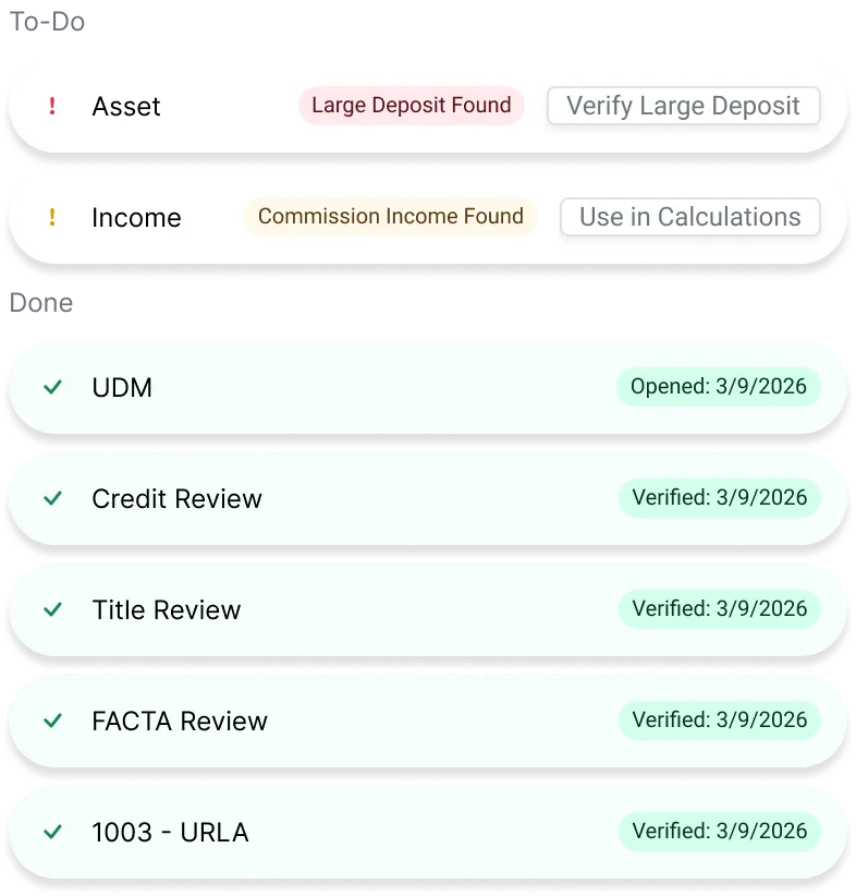 Every bottleneck between loan setup and closing — document validation, condition creation, compliance checks, manual handoffs — is automated so it won’t slow you down.